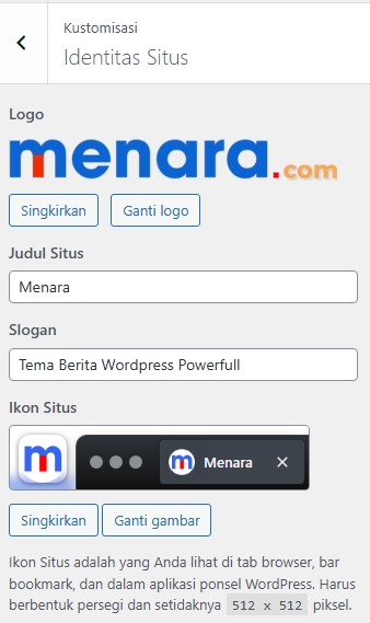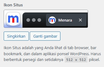WordPress akan menampilkan preview favicon di tab browser dan aplikasi mobile.