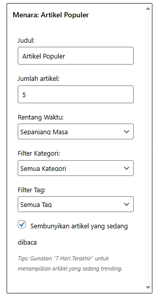 Layaknya widget popular post Wodrpress pada umumnya, tapi disini sudah di custom untuk kebutuhan website berita, dan Anda bisa kustomisasi sesuaik keinginan, alurnya sama seperti mengatur widget Topik Populer atau widget Rekomendasi.