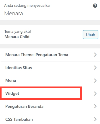 Pertama! masuk ke menu Susuaikan di dashboard Wordpress Anda, lalu pilih menu Widget: