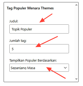 Untuk mengatur tampilan widget Topik Populer, secara default tema Menara ini sudah otomatis menggunakan pengaturan dengan rentan Sepanjang Masa, namun Anda bisa mengatur Topik kapan saja yang di tampilkan di widget ini.