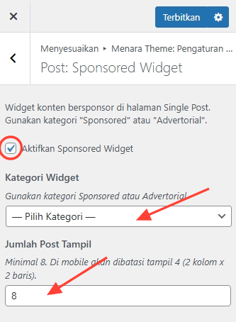 Pertama masuk ke Tampilan > Kustomisasi > Menara Theme > Post: Sponsored Widget: