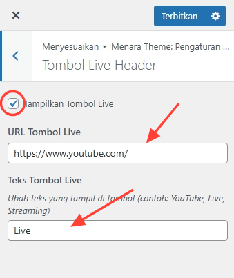 Aktifkan fitur ini dengan mencentang opsi "Tampilkan Tombol Live" agar tombol muncul di bagian atas situs.