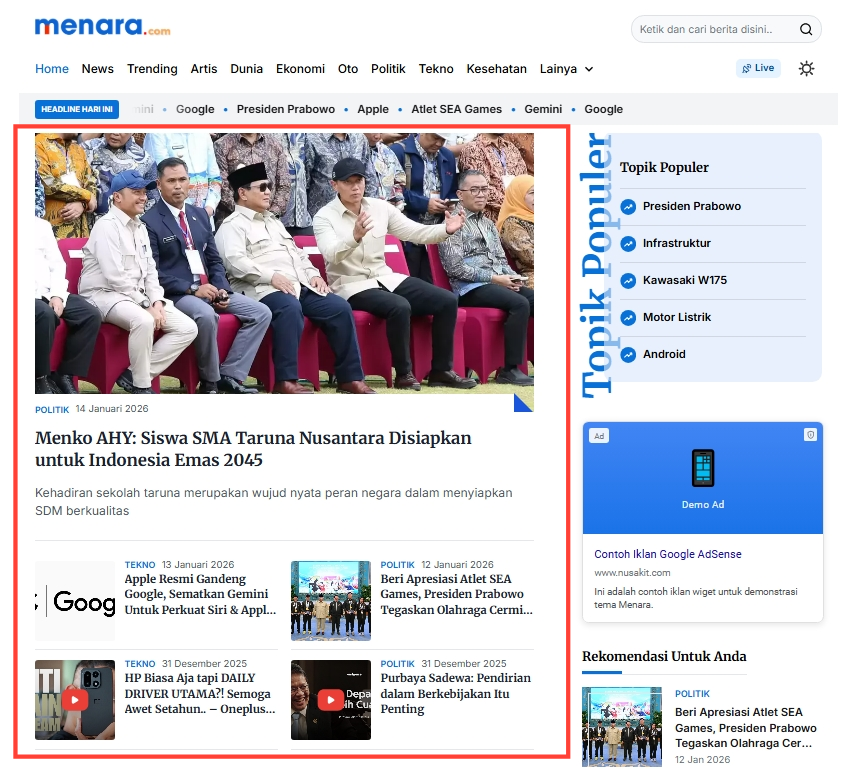 Kedua dropdown memungkinkan Anda memilih kategori atau tag yang relevan untuk masing-masing bagian, sehingga tampilan homepage dapat disesuaikan dengan fokus editorial atau tema konten yang sedang diangkat.