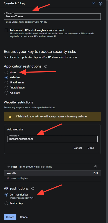 Di bagian “API restrictions”, pilih Don't restrict key agar lebih aman.