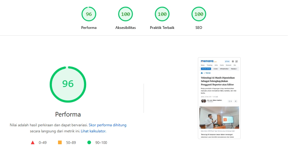 Menara Theme dioptimasi untuk mencapai skor sempurna di Google PageSpeed Insights: