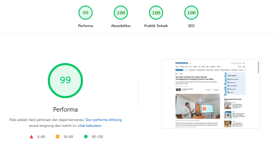 Kecepatan PageSpeed 95–100: Core Web Vitals lulus di Mobile dan Dekstop, lazy loading images, critical CSS inline, preloading font, minimal blocking JS, siap mobile-first indexing.